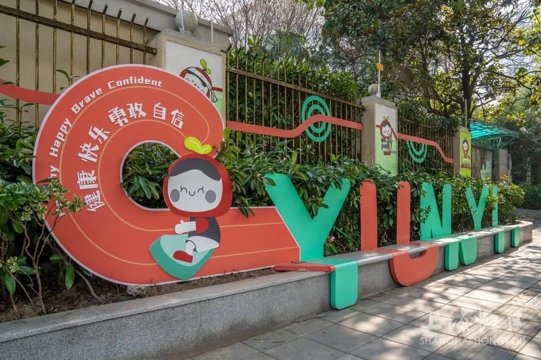 位于辉河路上的运一幼儿园进行了围墙外观立面提升,一侧设计了以幼儿园IP形象为主角的运动手绘墙面,以及“YUN YI”拼音字母座椅。
