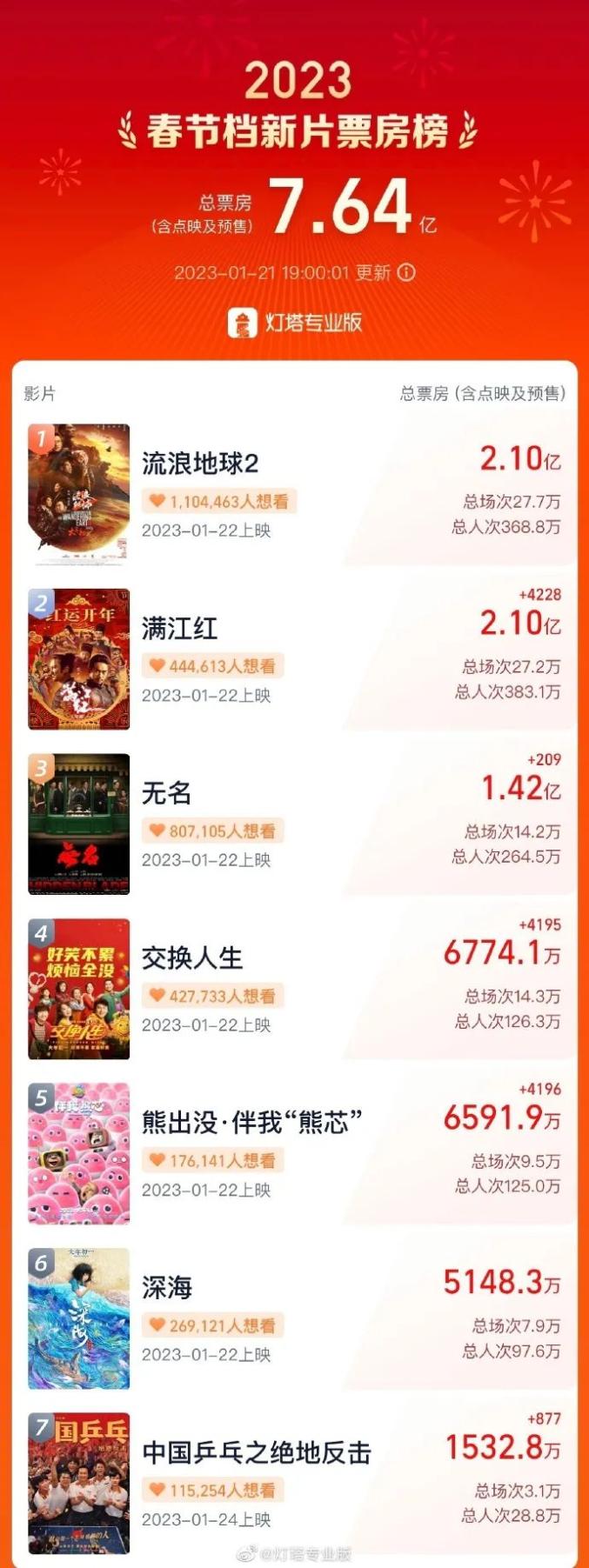 据灯塔专业版实时数据,1月21日19时,2023年春节档新片预售总票房达7.64亿。《流浪地球2》《满江红》《无名》分列预售票房榜前三位。