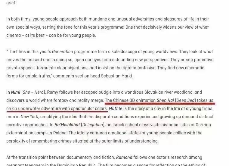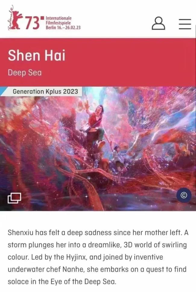 喜上加喜的好消息是《深海》刚刚入围柏林国际电影节新生代单元。柏林国际电影节是国际A类电影节又是欧洲三大且社会公认最权威的电影节之一,此前仅有极少的动画电影入围柏林国际电影节。