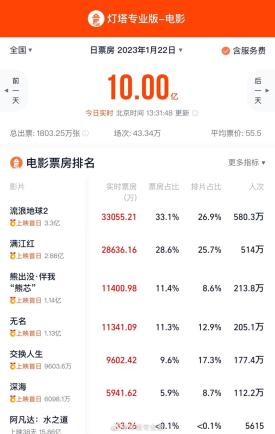▲据平台实时数据,1月22日13时31分,兔年大年初一(1月22日)总票房突破10亿,《流浪地球2》《满江红》《熊出没·伴我“熊芯”》分列票房前三位。
