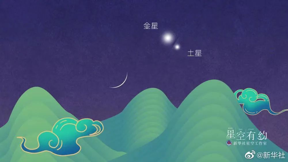 ▲天文科普专家介绍,1月22日和23日的日落后不久,在西南方低空,太阳系的两颗行星金星与土星会离得非常近,上演“星星相吸”。有趣的是,23日傍晚,一弯细细的蛾眉月也会加入进来,来到双星身边,上演“月伴双星”。
