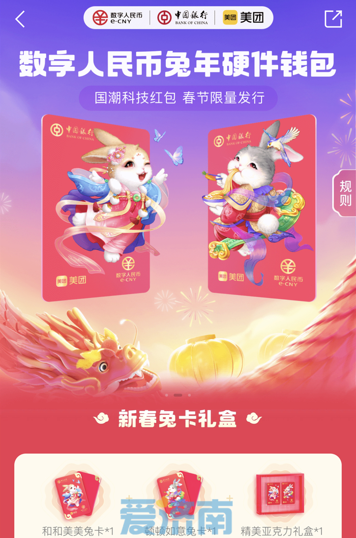 据高敏介绍,自去年12月底开始,中国银行已联合美团开展宣传推广活动,发行以“数字人民币硬件钱包”为载体的兔年硬件钱包卡。截止到今年2月28日,用户可通过访问美团App指定活动页面(如搜索“兔卡”)进行产品购买,消费者充值数字人民币后,可以生成充满科技感的数字红包馈赠亲朋好友,也可在线上线下各类场景中,“碰一碰”完成支付消费。