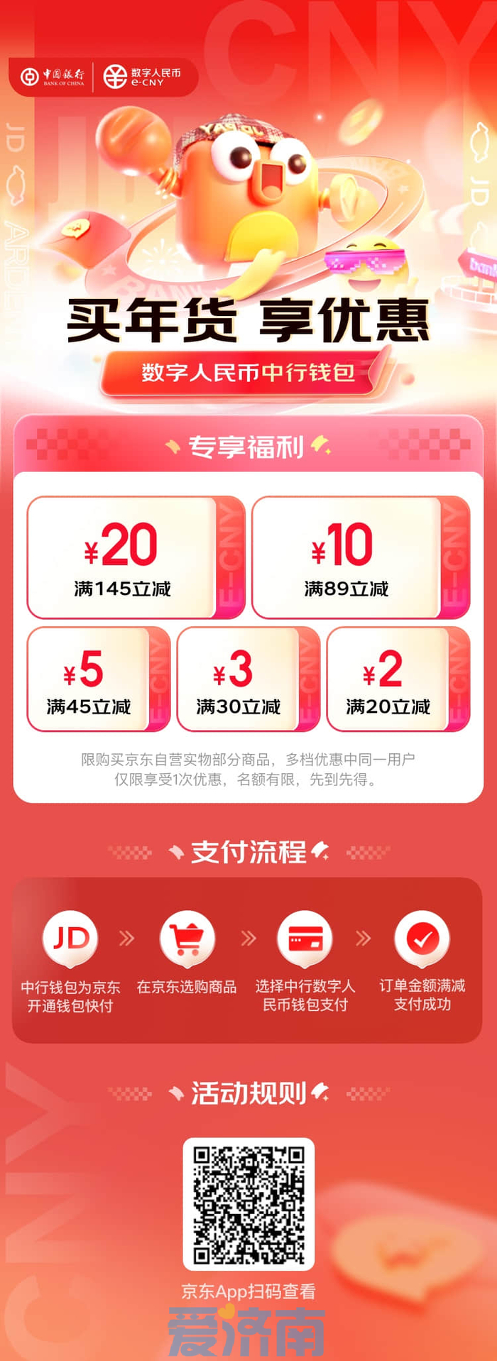1月18日00:00:00至2023年2月15日,中国银行·京东平台“买年货享优惠”活动,开立中国银行钱包且开通京东快付功能的用户可以在京东指定App购买京东自营部分实物商品(特殊商品除外),订单应付金额满足指定优惠门槛后,使用中国银行数字人民币钱包支付即可享受对应优惠,优惠档位具体如下:满20减2元、满30减3元、满45减5元、满89减10元、满145减20元等等。名额有限,先到先得。