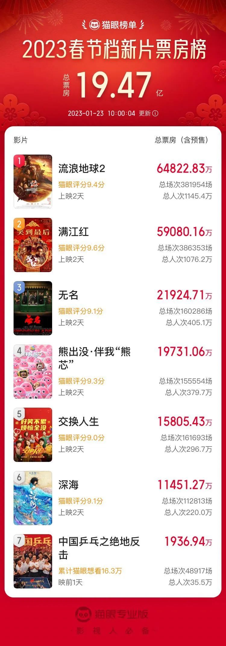 据猫眼数据,自大年初一至初二10点,34小时之中春节档票房已达到19.47亿元,大年初一票房达到13.46亿元,总场次42.7万场。其中,《流浪地球2》和《满江红》强势领跑,分别斩获4.74亿票房和4.02亿。而此前在预售中从未跌出三甲位置的《无名》却不及预期,一度被动画电影《熊出没·伴我“熊芯”》反超。