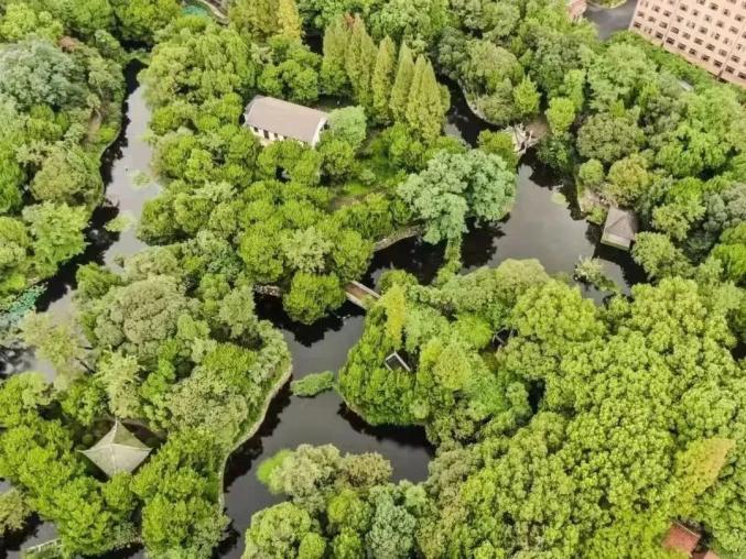 整座花园呈东西向的椭圆形,园内花木葱茏,布置精巧,波光岛影,相映成趣,园湖内有三个大岛环绕交错,岛与岛,岛与环路,均以亭桥相连,构成全园盛景。
