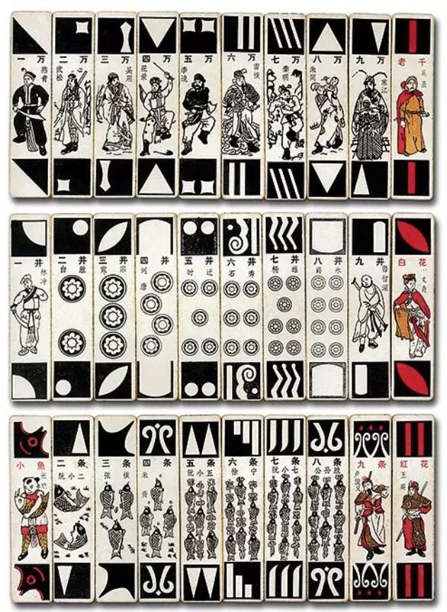 比如,九条就暗喻“九纹龙”史进、一饼就是“黑旋风”李逵。这些好汉来自四面八方,所以有了“东、南、西、北”四套牌面,梁山聚义的各路英雄有贫有富、出身也各有不同,又有了“中、发、白”三套牌面,中代表中产之家,发就是发财大富之家,白则指白丁、贫民。