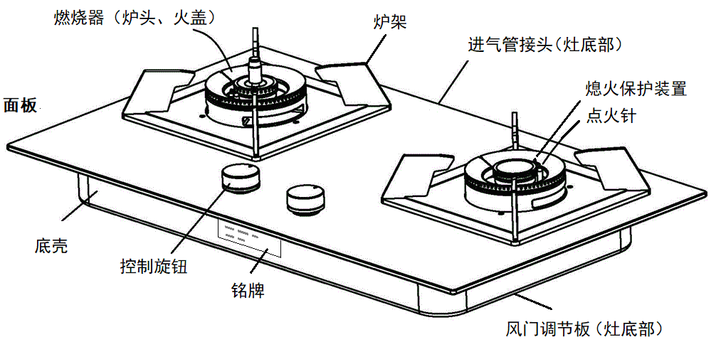 家用燃气灶是通过燃气的化学能向热能转化来烹调菜肴、加工食品的厨房燃气用具。它是由燃烧器(炉头、火盖)、炉架、控制旋钮、熄火安全保护装置(热电偶式和离子式)、点火针、风门调节板和进气管、面板、底壳和内部的燃气阀等部件构成。