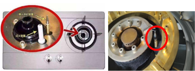 (4)注意是否配备熄火保护装置。根据现行国家标准要求,家用燃气灶必须带熄火保护安全装置,以便在发生突然熄火时起到保护作用,防止燃气泄漏。判断是否有熄火保护装置的方法是观察炉头内侧位置是否有热电式或离子式熄火保护探针。