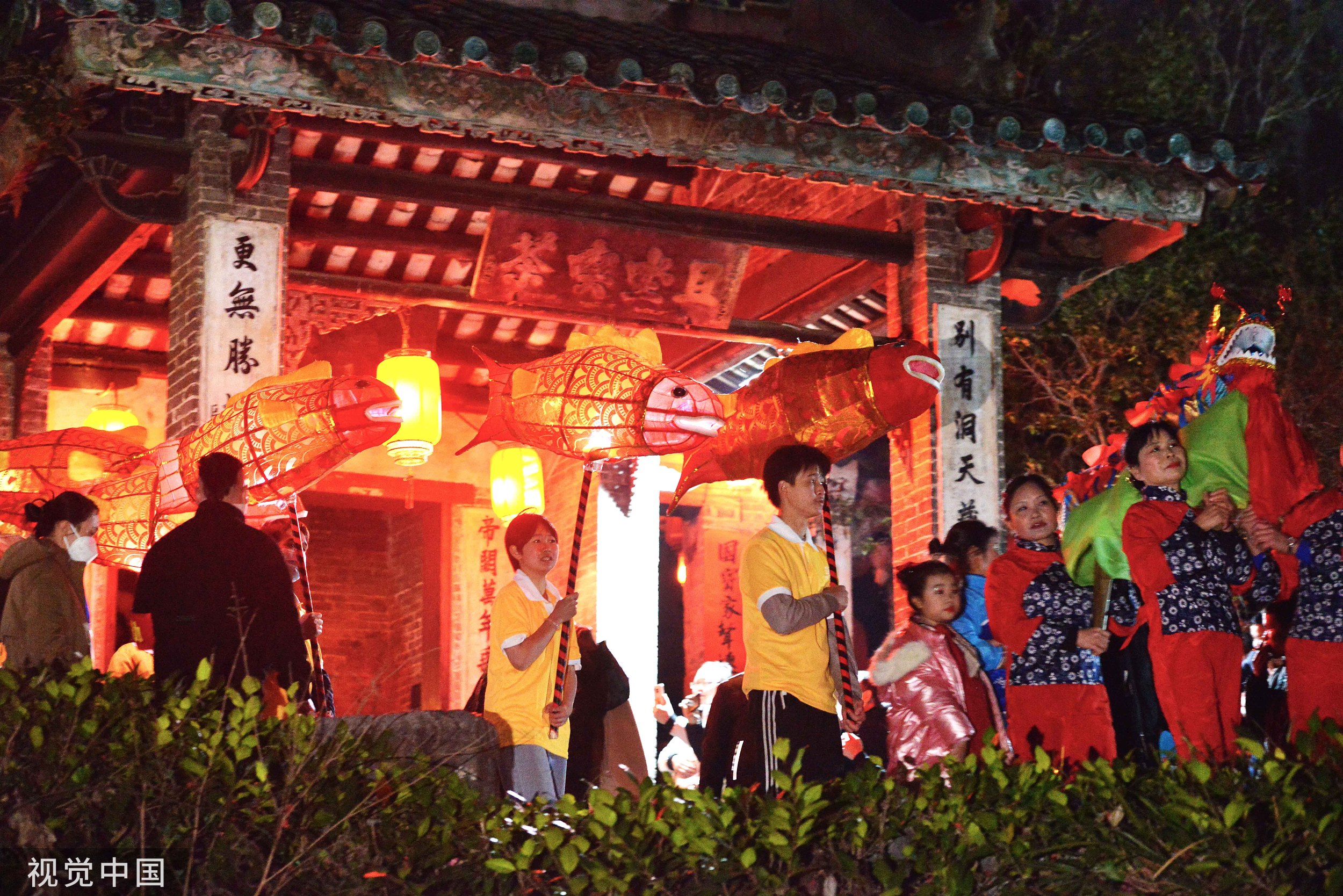 2023年1月23日晚,广西贺州,昭平县黄姚古镇,当地群众和游客在舞鱼龙游行中。