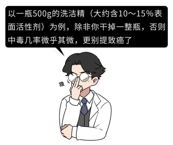 如若想让一个体重60kg的人因洗洁精而急性中毒死亡,至少需要摄入60g的表面活性剂。