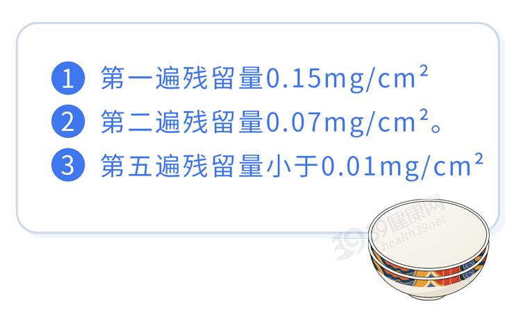 按照国标GB14934-1994规定,洗涤剂残留应该小于0.1mg/cm⊃2;。从实验结果来看,一般冲洗两遍即可达标,大家不必过于担心。