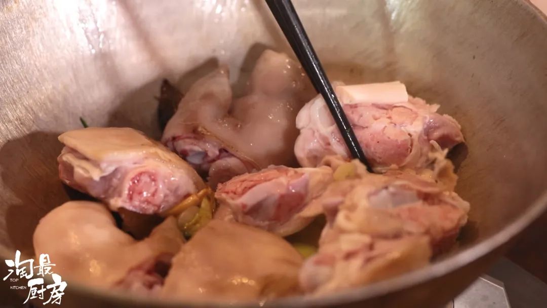 随后倒入开水,和猪手齐平,大火煮开后转小火炖煮50分钟。