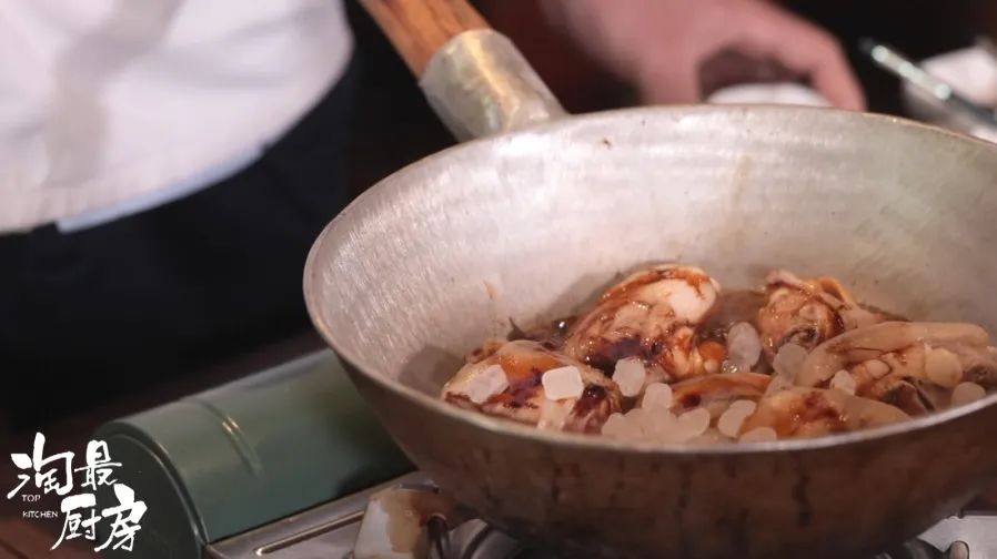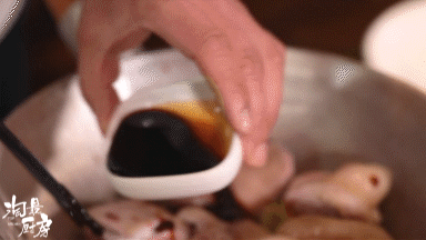 往锅中加1调羹(15g)蚝油、1调羹(15ml)生抽和1调羹(15ml)黄酒去腥提香,再加1调羹(15ml)老抽和1调羹(15g)冰糖上色。