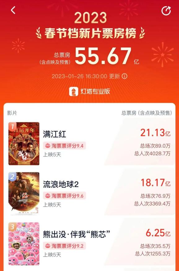 其中《满江红》票房超21亿元排在7部春节档新片首位