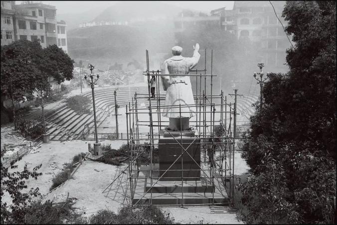 2012年8月,金沙江最末端的向家坝电站库区建筑物拆除工程全面展开,工人们准备将绥江县红太阳广场上的毛主席塑像拆除、吊装运往新县城。云南绥江2012.08