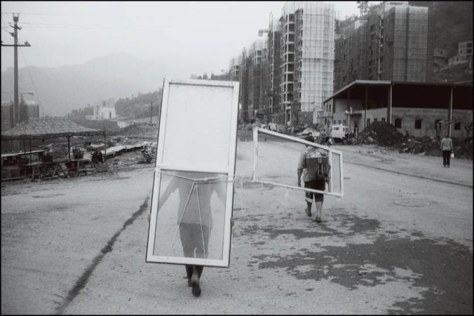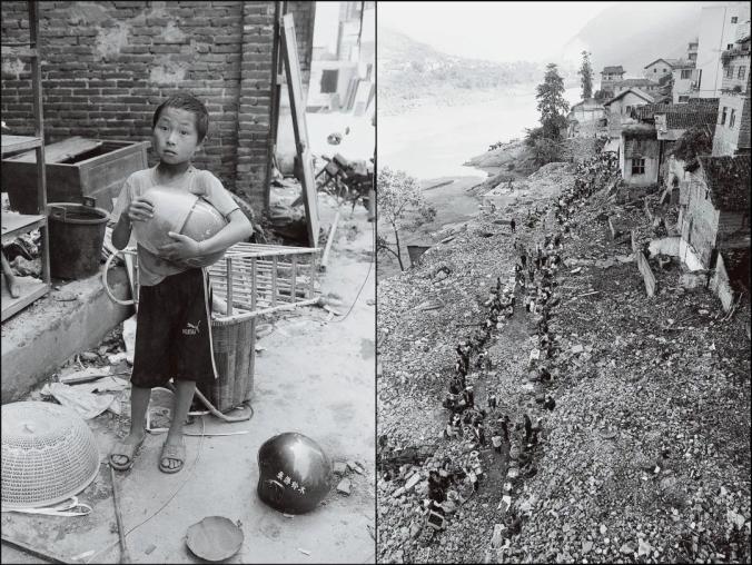 左图:捡到头盔的学生。云南绥江2012.08右图:新滩新镇还在建设中,老街一夜之间被夷为平地,老百姓照常在“老街”上赶场。云南绥江2009.09