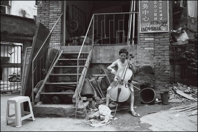 在搬空的自家门前拉琴的移民。四川屏山2012.06