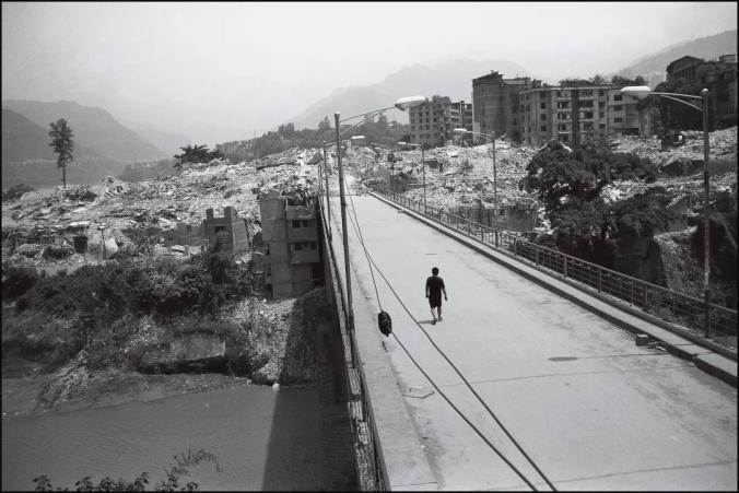 走在绥江大桥上的男子,眼前一片狼藉。云南绥江2012.08