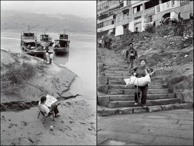 左图:两岸移民陆续搬迁后,过河的乘客少了,侯客的船老板一杯清茶,一张报纸打发时光。四川屏山2010.09右图:女人从男人手中抢过小猪奔向码头。四川屏山2007.11