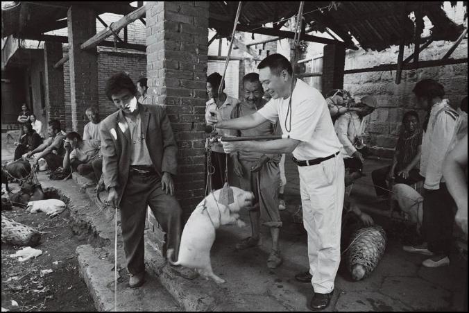 市场管理人员在为买卖双方称“双月猪”。云南绥江2008.06