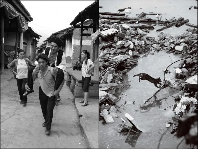 左图:背老人到街上看病的儿子。 云南永善2011.07右图:江水越涨越高,奋力跳过废墟逃命的猫。云南绥江2012.10