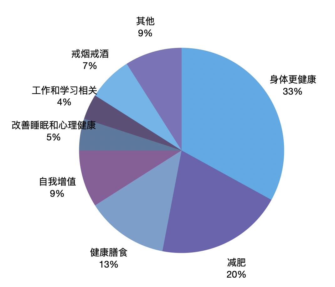 在世界范围内也是如此,一项来自欧洲的研究调查了1066人的新年目标[1],结果发现排名前三的目标都和健身减肥相关,33%的目标是改善健康,20%目标是减肥,13%的目标是健康膳食。