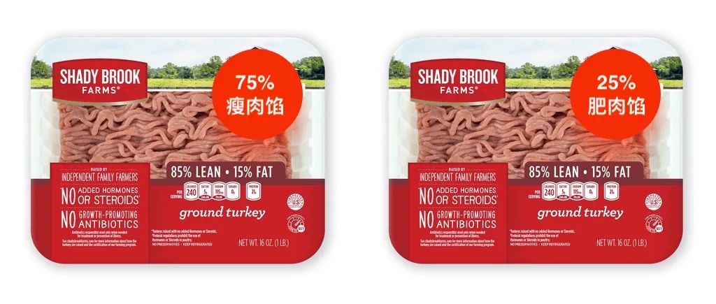 比如下面的图中,同一种牛肉馅,一个在包装上标注“75%瘦肉”,而另一个在包装上标注“25%肥肉”,你会买哪一种呢?