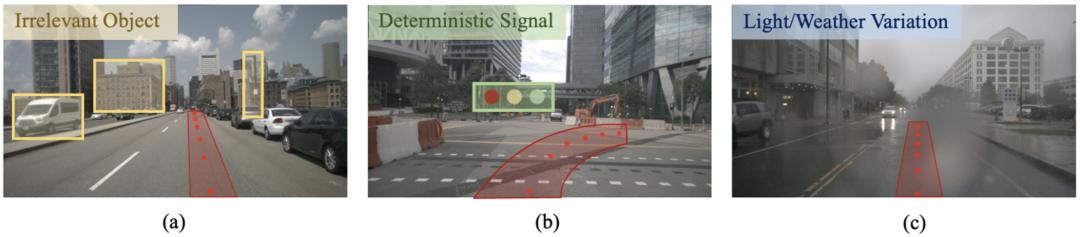 (c) 端到端驾驶策略模型必须对不同的光照和天气条件具有鲁棒性。