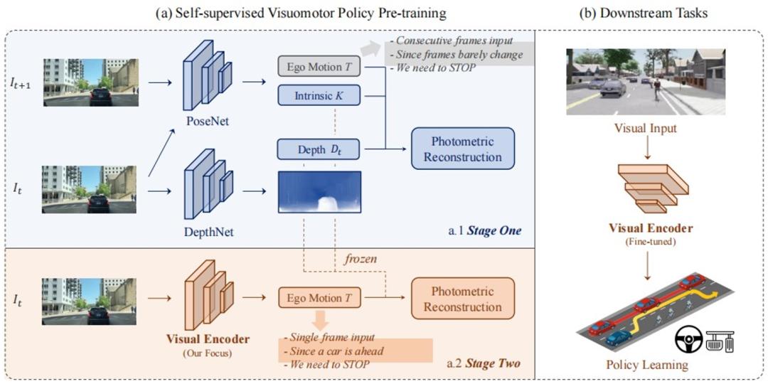 图 3:PPGeo 的概述。(a) 在第一阶段 (a.1), 利用前后帧图像作为输入,训练一个位姿预测网络 PoseNet 和深度预测网络 DepthNet,位姿预测网络通过比较前后帧图片推测出自车运动,并结合深度和相机内参估计完成两帧之间的像素对应,从而形成监督。在第二阶段 (a.2),待预训练的视觉编码器仅以单帧图像作为输入,在当前帧图像中捕捉与驾驶策略真正相关的信息来预测自车运动,并利用第一阶段获得的内参和深度估计完成像素对应。在这个说明性的例子中,自车需要刹车。位姿预测网络(a.1)根据连续两帧几乎没有变化来推断出刹车行为;而视觉编码器(a.2)根据单一视觉输入中前方有他车来做出预测。(b) 视觉编码器可以被微调并应用于广泛的下游任务中。第一阶段 - 自监督的几何建模