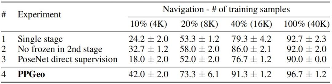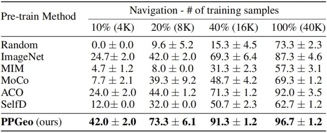表 1:闭环导航任务的成功率结果可以看到,模型在从 10% (4K) 到 100%(40K)的不同数量的微调样本下进行测试。在训练样本量特别小的情况下,PPGeo 依然表现出有竞争力的表现,并且相对其他方法有超过 100% 的提升。这验证了预训练视觉编码器的泛化能力,这在适应标记数据非常有限的新环境时非常重要。