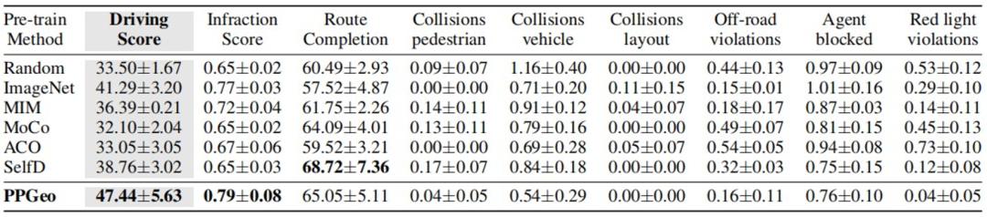 表 2:闭环任务 Town05-long 任务结果。除三个主要指标外,其余违规详细信息(越低越好)上 PPGeo 也均表现优秀强化学习在 CARLA 中的驾驶任务