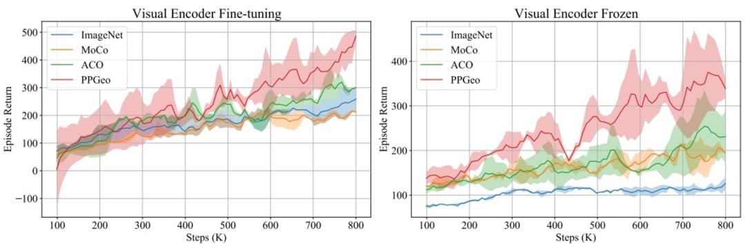 我们进一步验证预训练方法对于强化学习任务的帮助。我们使用强化学习算法近端策略优化 (PPO) 在 CARLA Town01 环境中训练使用不同预训练权重初始化的 CILRS 模型(左)。我们进一步实验在训练期间冻结预训练的视觉编码器(右),以更好地研究预训练特征表示的有效性。