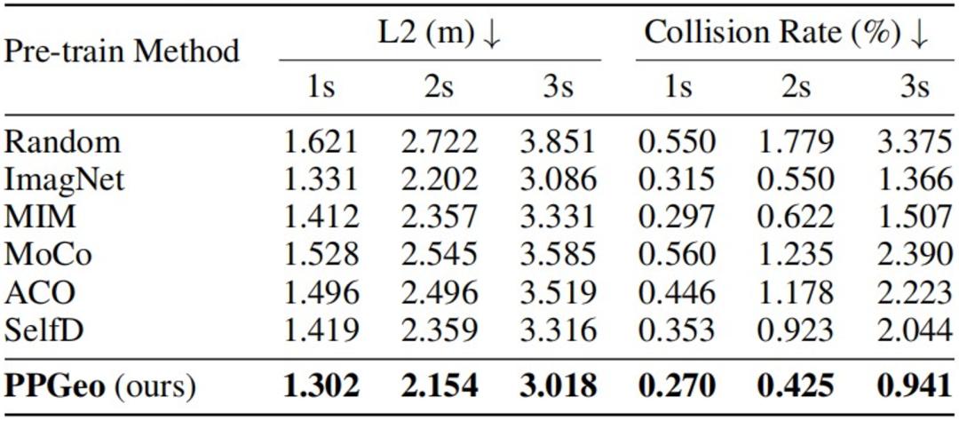 我们使用真实世界的 NuScenes 数据集评价不同时间长度下的轨迹规划预测与实际真实轨迹之间的 L2 距离以及规划轨迹导致的碰撞率。相较其它预训练方法,PPGeo 在下游开环规划任务上也取得了最优的效果。