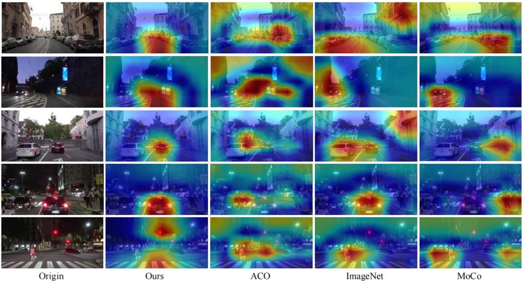 图 6:驾驶视频数据上不同预训练方法学习表征的可视化热图消融研究