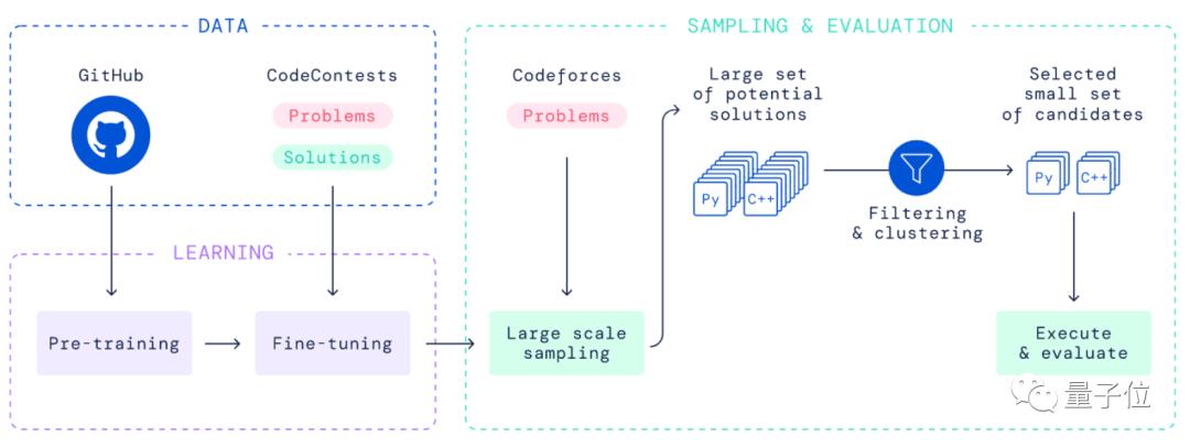 AlphaCode由DeepMind打造,基于Transformer模型打造,通过采用GitHub中715.1GB的代码进行预训练,并从Codeforces中引入一个数据集进行微调,随后基于Codecontests数据集进行模型验证,并进一步改善了模型输出性能。