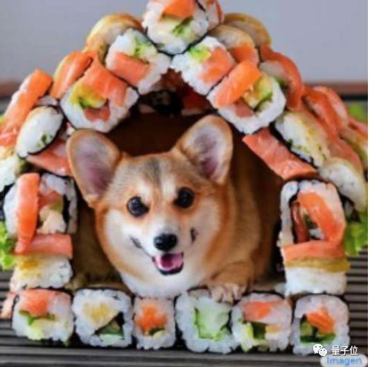 Imagen来自谷歌,基于Transformer模型搭建,其中语言模型在纯文本数据集上进行了预训练。Imagen增加了语言模型参数量,发现效果比提升扩散模型参数量更好。下图是Imagen根据“一只可爱的柯基住在寿司做的房子里”生成的图像: