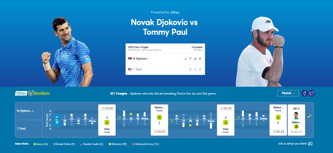或许是吊着的一口气被德约彻底打散,此后美国选手保罗的表现可谓是一泻千里,随后两盘比赛,德约继续在接发球上表现出色,在减少失误的同时进一步保持高强度的施压。期间他打出极为精彩的正手大角度“扫射”,并以6-1拿下次盘较量。