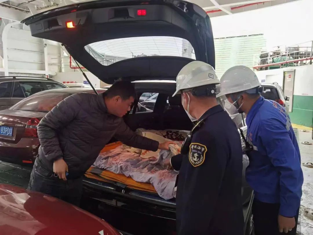 在客滚船舱内,海事执法人员检查待渡车辆的随车物品。通讯员 赵强 摄