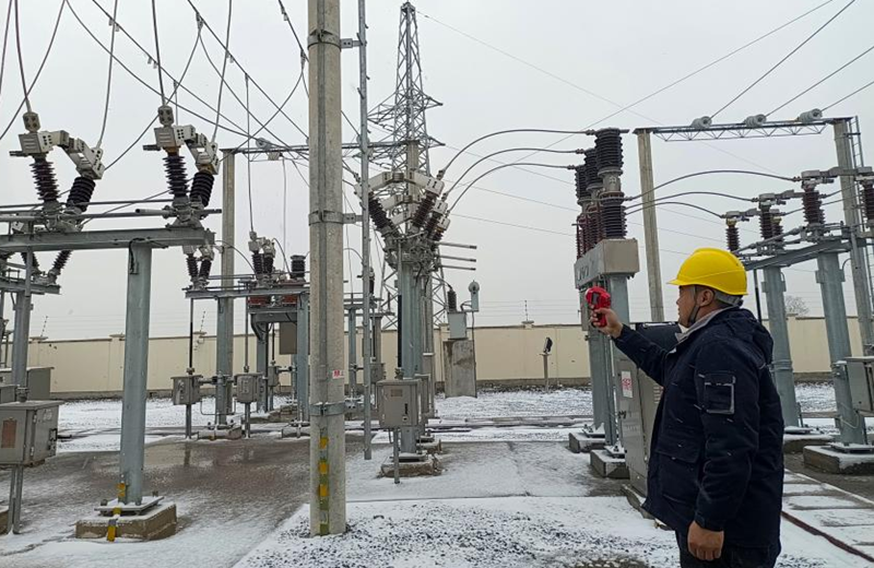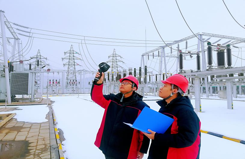 1月23日,冀北唐山供电公司变电运维员工在220千伏李钊庄变电站为2号主变压器测温。(赵刚)