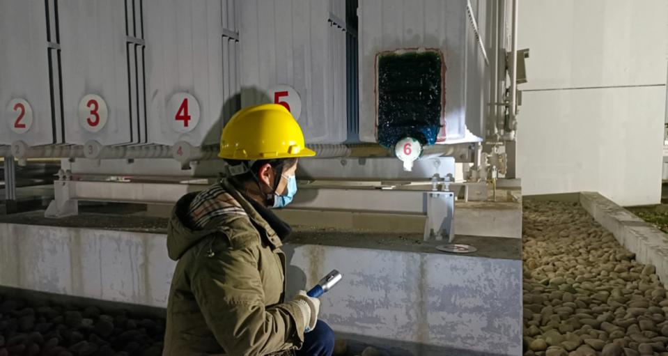 1月24日5时21分,江苏盐城供电分公司员工在500千伏盐都变电站内验收1号主变压器4号低抗6号散热片渗油堵漏工作。(黄凤晓)
