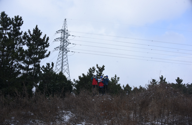 1月23日,山东烟台栖霞供电公司党员服务队队员冒雪特巡110千伏丰栖线29号塔。(张峻)