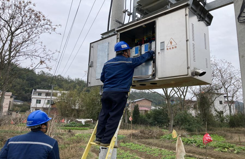 1月22日,江西赣州上犹供电公司兰田供电服务站员工刘家文、肖昌茯在塘兰六村2号配电变压器台区调整智能断路器负荷参数设置。(黄长军)