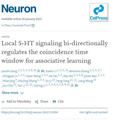 2023年1月26日,北京大学/深圳湾实验室李毓龙团队在《神经元》(Neuron)期刊在线发表了题为“Local 5-HT signaling bi-directionally regulates the coincidence time window for associative learning”的研究成果,以经典的果蝇嗅觉学习记忆为范式,结合李毓龙验室开发的多种神经递质荧光探针,发现五羟色胺双向调节学习记忆的“一致性时间窗口”的新机理,并进一步解析了五羟色胺对突触可塑性的调节,及其发挥功能的负反馈神经环路。