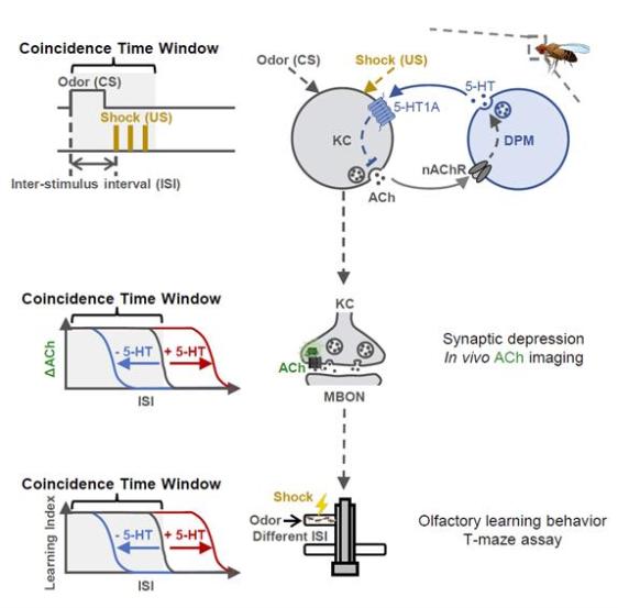 学习记忆的本质是突触可塑性变化,经典的电生理研究表明嗅觉学习记忆形成伴随着蘑菇体(mushroom body,果蝇的嗅觉学习记忆中枢)中KC(Kenyon Cell)和MBON(mushroom body output neuron)之间的突触抑制(synaptic depression)现象。团队成员利用该实验室开发的乙酰胆碱探针复现了这一研究结果,在此基础上发现“气味-电击”的时间间隔延长会导致可塑性变化消失,测量得到的“一致性时间窗口”为14.8 s,与行为学上16.9 s的数据极为相近。更重要的是,人为降低或者升高五羟色胺水平同样能改变时间窗口的长短,表明五羟色胺是通过调节突触可塑性,从而最终影响了学习行为。