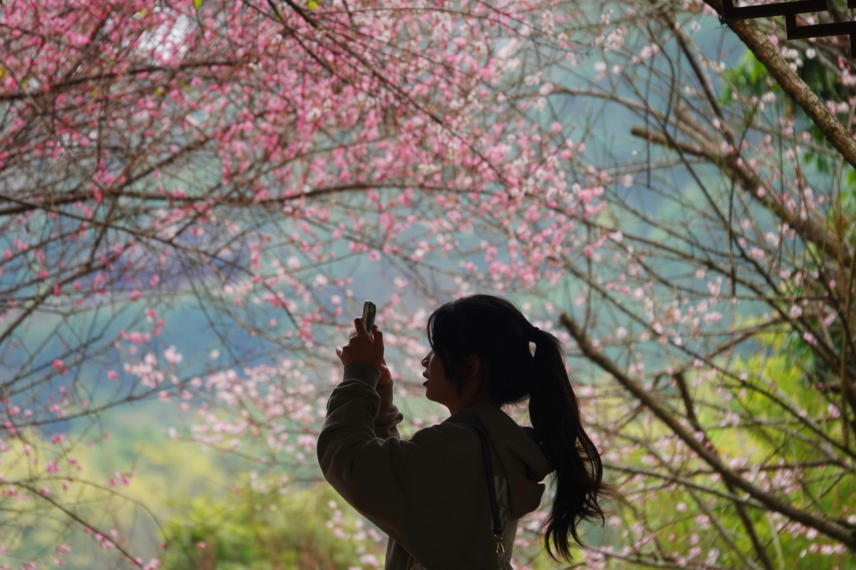 2023年1月27日,南宁,市民在青秀山风景区兰苑景点观赏梅花。