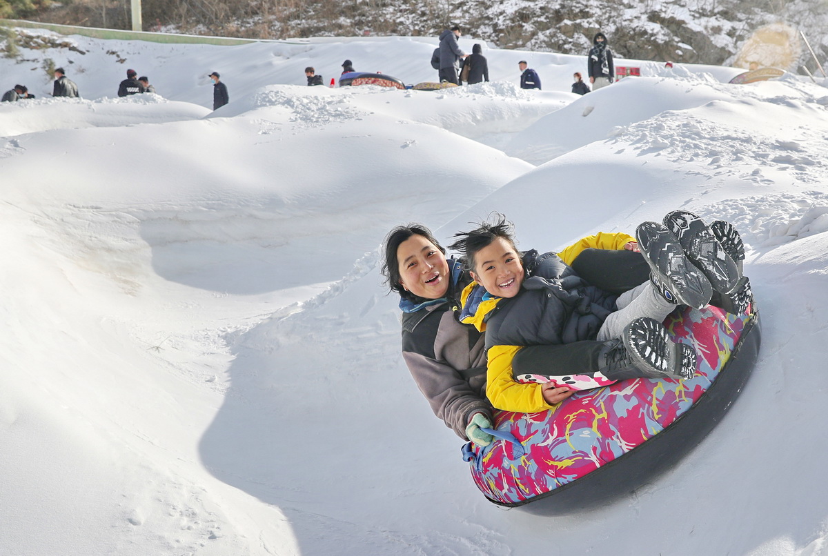 2023年1月26日,在位于河北秦皇岛海港区石门寨镇的老君顶景区内,游客在体验雪圈。