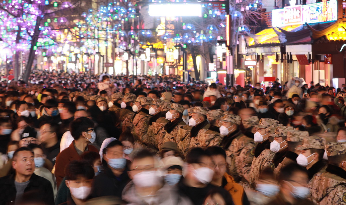2023年1月26日,南京,武警官兵在秦淮灯会上筑成人墙,保护群众安全。