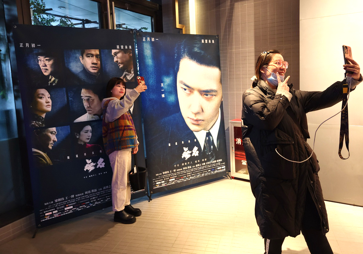 2023年1月24日,武汉,众多市民走进电影院观看电影。观众在电影《无名》海报前打卡拍照。