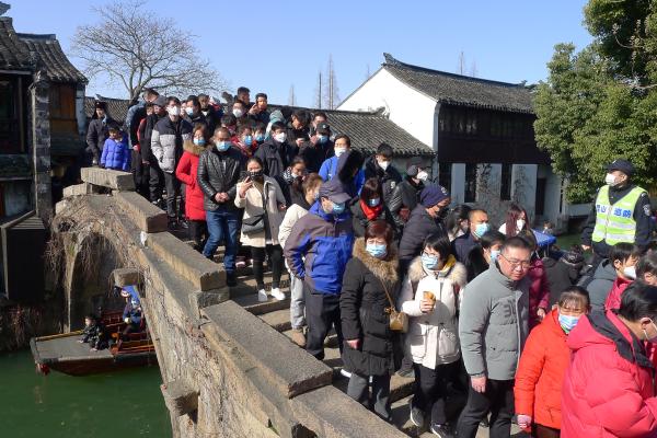 2023年1月25日,江苏周庄古镇春节期间免费开放,游客排队过双桥。澎湃新闻 高剑平 图