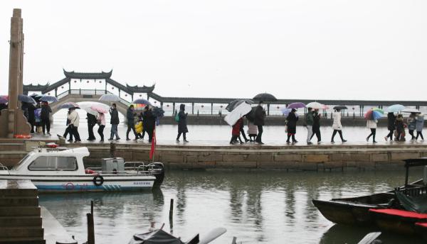 2023年1月23日,江苏锦溪古镇,大雨和强冷空气都阻挡不住人们出游的脚步。澎湃新闻 高剑平 图